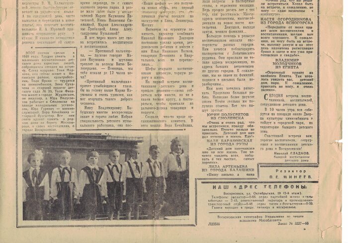 Большую помощь в розыске воспитанников оказали паспортисты разных городов. Нам хочется поблагодарить паспортисток с Лопатинского рудника. Они прислали не только адреса воскресенцев, но и адреса бывших детдомовцев из других городов. К сожалению, мы не знаем их фамилий, подписи в письмах были неразборчивы…