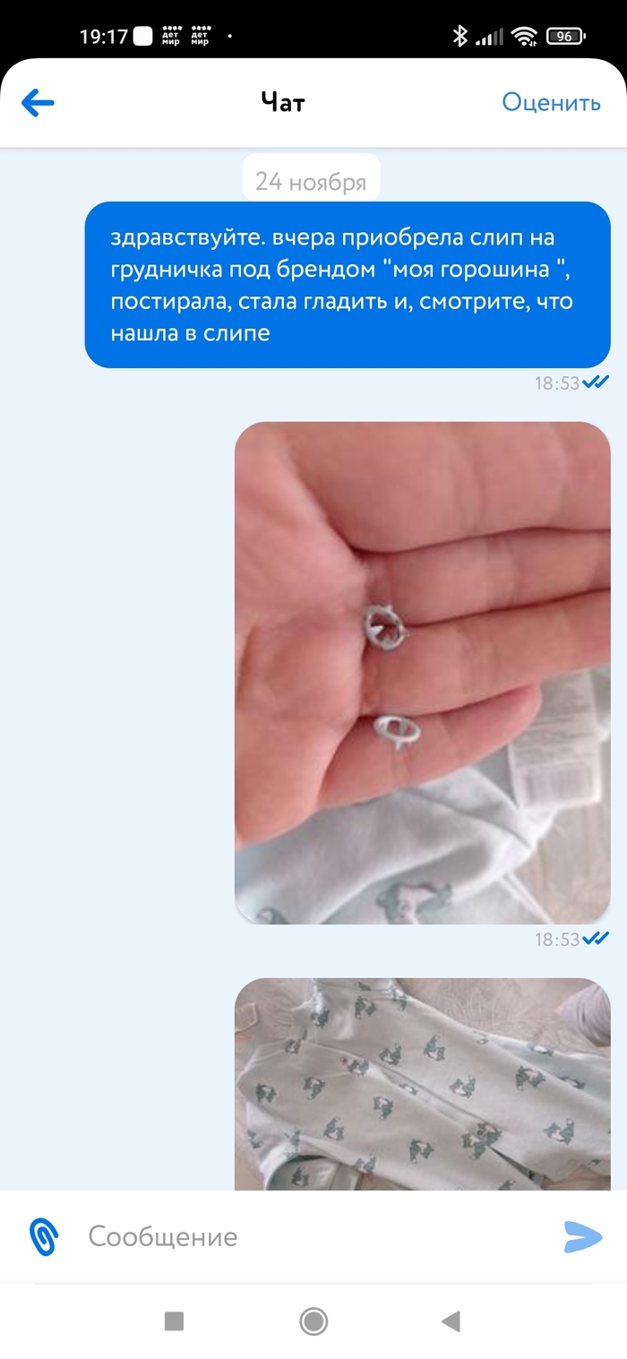 Как правильная мамашка постирала, достала сегодня гладить, отрезала бирку (на ней нарисованы ножнички, мол, режьте-не стесняйтесь). Сегодня достала гладить, да, имею я такую привычку. Открыла всё кнопки и тут бац-бац. Что-то упало на пол, поднимаю вот такую штучку, с острыми такими краями. С удивлением осматриваю слип и тут и вторая упала.