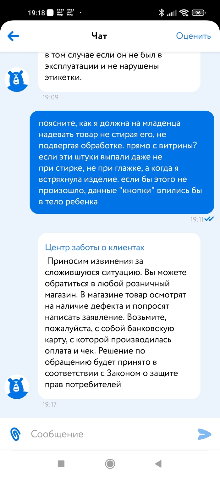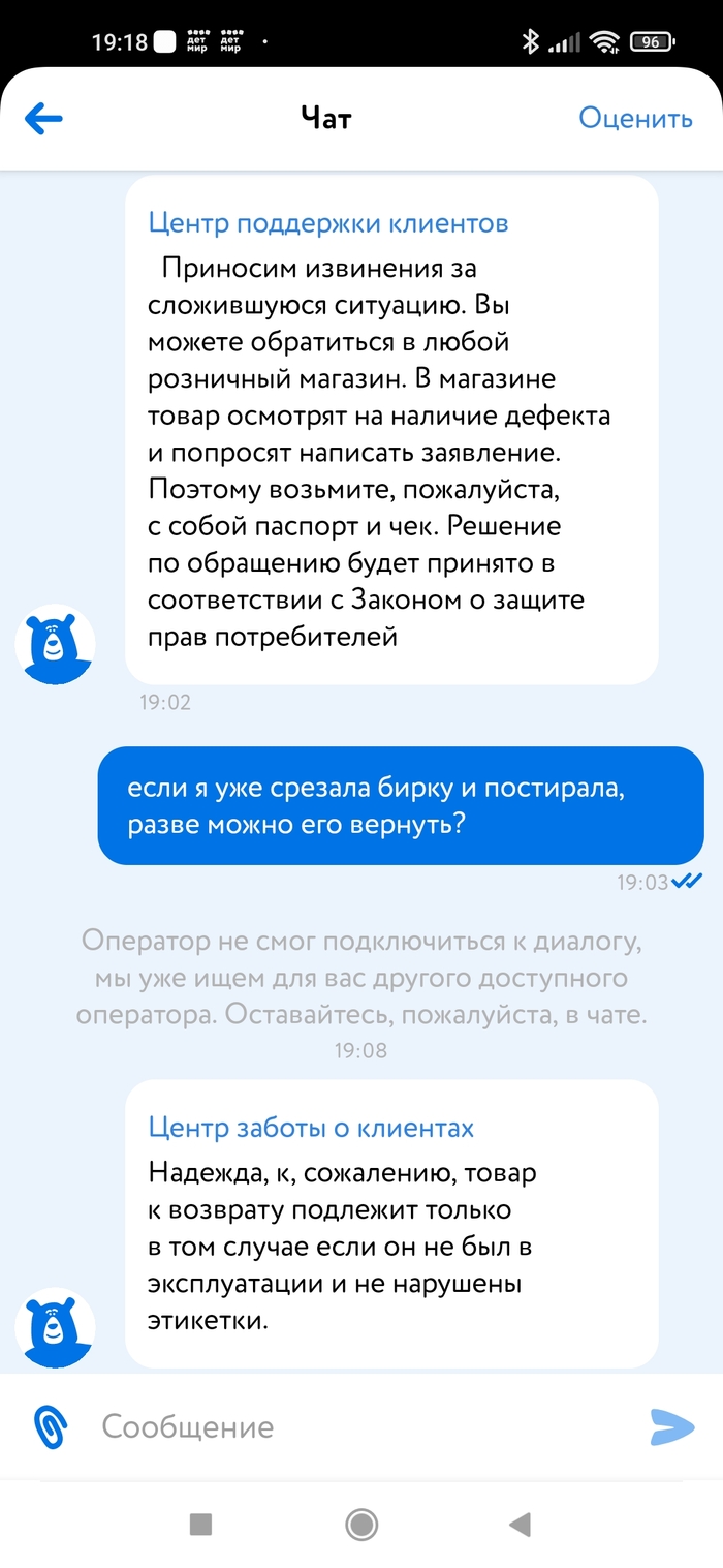 Случай намбер ван. Готовились к рождению малыша. Выбирали матрас в кроватку. По рекомендациям нашли в детском мире. Заказали через интернет. Срок доставки 5 дней. Ну ок. 1 день, статус заказа, собирается. 2 день, статус заказа, собирается, 3 день, статус заказа собирается, 4 день, статус заказа собирается. Решил узнать, есть ли он в наличие или его в срочном порядке шьют, ждать или не ждать в принципе. Написал в поддержку, спросил, что с заказом. Ответа не поступило, но статус заказа стал отменен. Хм... Решил позвонить. Суть разговора такая, что для отмены должно было быть моё согласие, котороя я не давление, почему отменили, сказать затрудняется. Перезаказал матрас, приехал через пару дней.