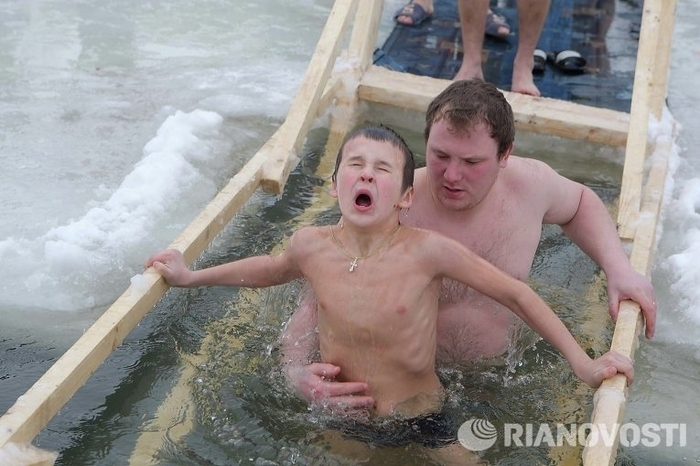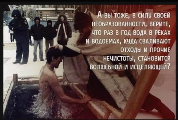 Но всё это безсознательно и безумно творимое мракобесие не имеет никакого отношения ни к Богу, ни к вере. О чём, кстати, ежегодно перед каждым крещением говорят все вменяемые батюшки. Купание в проруби – просто народная традиция, как прыжки через костёр накануне Ивана Купалы. Оно не смывает никаких грехов и вообще нахой никому не нужно. Только полные мракобесы и невежды могут додуматься макать младенцев в ледяную воду! Да и родителям лезть туда не за чем. Но им ведь реально пох и на самих себя, и на своих детей – ритуально и символически утопляемых, приносимых в жертву хз кому.