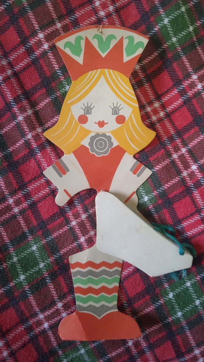 Малышка сохранила шапочку, но порвала пальто и штаны. Впрочем, все ещё выглядит неплохо, скорее благодаря тому, что синяя бумага хорошо сохранила цвет. Почему-то зеленая крепированая бумага, как выше видно у Тани, выцветала очень сильно- можно посмотреть на примере поросенка в конверте из моего предыдущего поста этой серии.