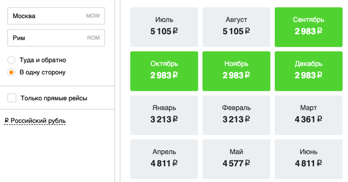 Я поставил диапазон дат от сегодняшнего числа. Получается, если есть возможность улететь сегодня, то перелет туда-обратно обойдется всего в 2,5 тыс. рублей. Хотя оранжевые квадратики намекают нам, что наличие мест на самолёт надо еще проверить.