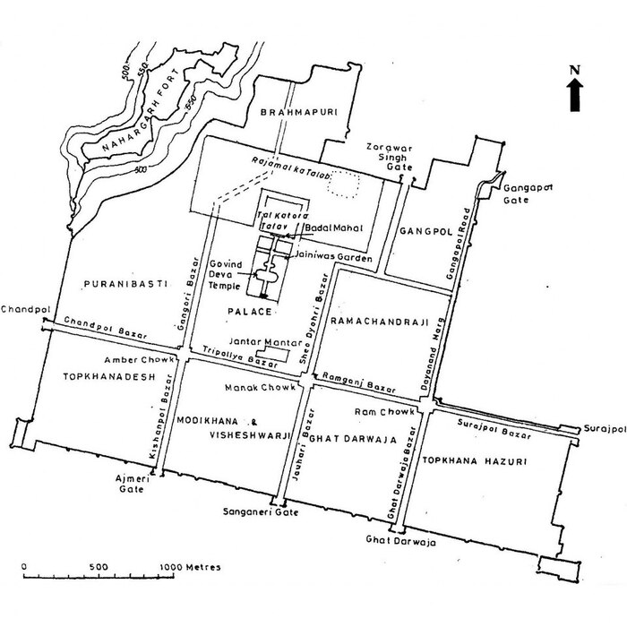 Градостроительные идеи, положенные в основу новых столиц, схожи: это ортогональная сетка, революционная для хаотичных российских и индийских городов того времени. Джайпур 1725 года, как и Петербург по плану Трезини-Леблона 1716 г., обнесён крепостными стенами. Основные доминанты, на которые ориентированы оси плана, — форты с храмами: Гарх-Ганеша и Петропавловский собор. Ширина улиц, размеры типовых домов и площадей — всё строго регламентировано: в Индии — по кастовой системе, в России — по сословной.