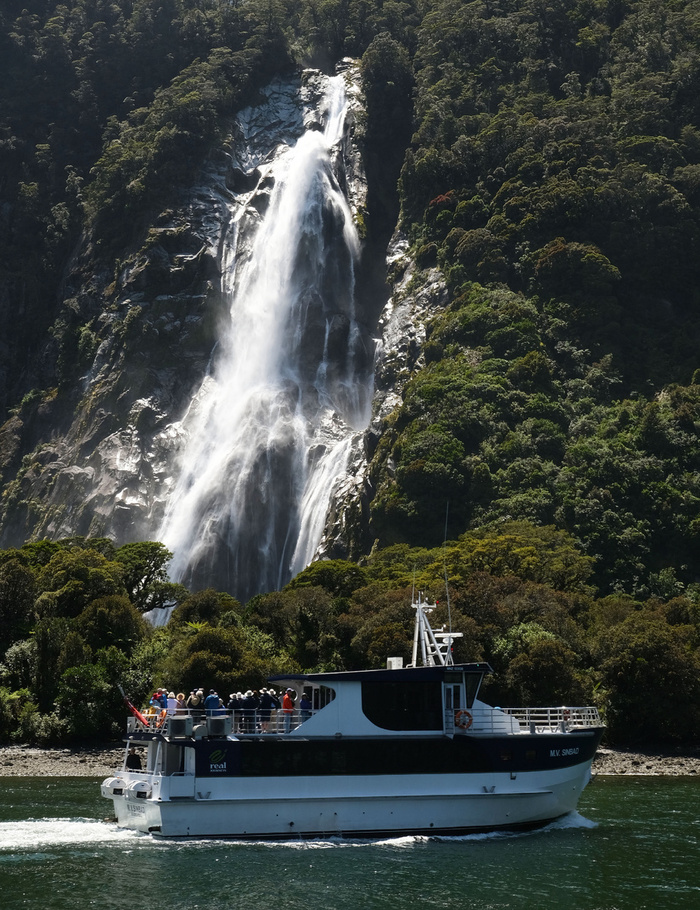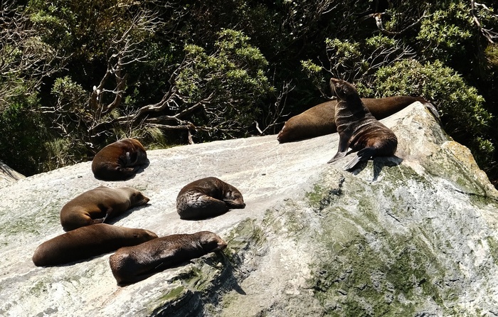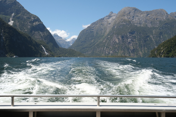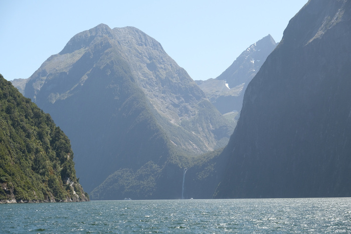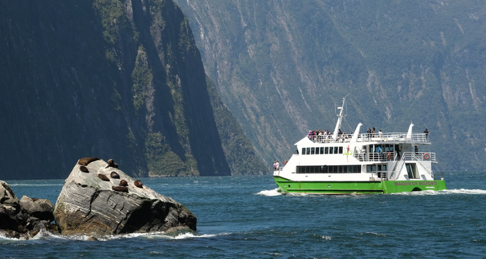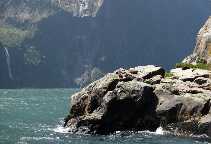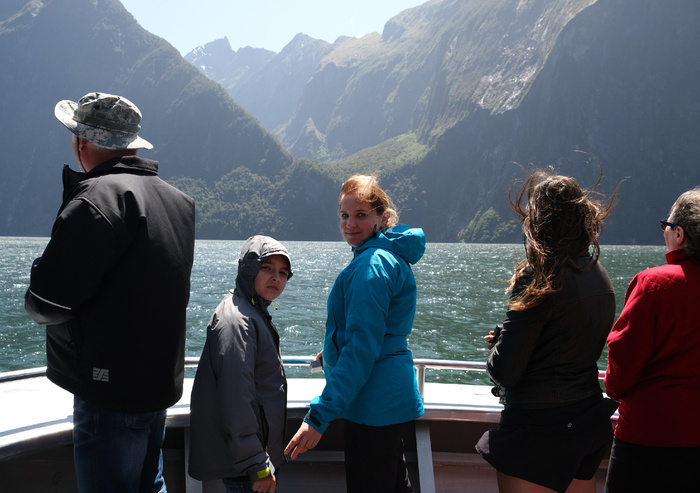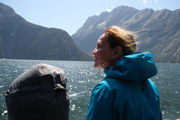 Прогулочных корабликов в Милфорд-саунде много, мы купили билеты на ближайший и поплыли вдоль залива в сторону океана. Сильный ветер с брызгами воды бил прямо в лицо. Сначала все туристы были на палубе, но минут через десять, по мере намокания и обветривания, энтузиазм поутих, и большинство людей перетекли в закрытую кабину.