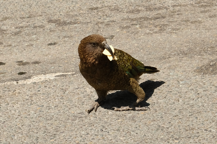 Пока попугай ел, мы прочитали, что это – кеа. Они очень умные и кормятся на таких участках дороги: светофор означает, что машины гарантировано будут стоять столько времени, сколько хватит на легкий перекус маленькой птичке.