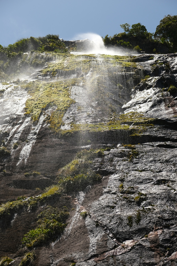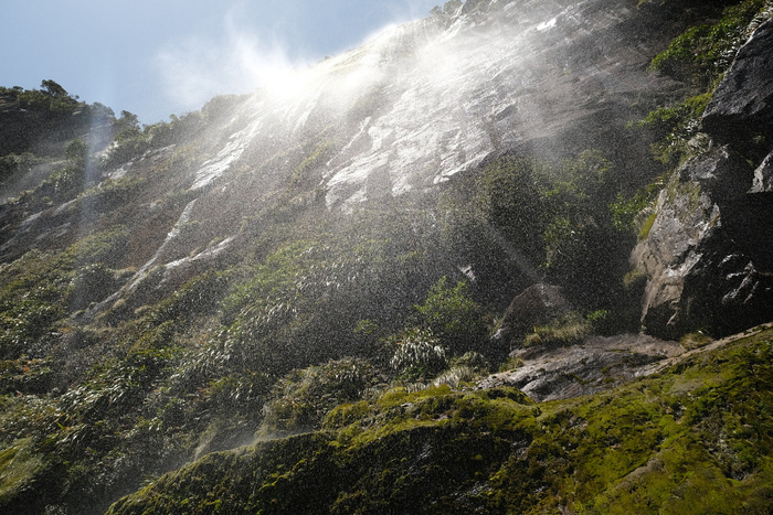 Мы свободно стояли на носу. Кораблик то летел на всех парусах, то подходил прямо к берегу и замедлял ход, чтобы туристы могли оценить многочисленные водопады: тонкие бодрые ниточки, плоско стекающие по скале ручьи, мощные потоки. Они торопливо и весело сбегали с высоких скал, дробились о камни, и в водяной пыли над Милфорд-саундом плыли радуги. В некоторых местах ветер играл с водопадами: не давал струе упасть во фьорд – подхватывал ее и снова забрасывал на скалу. Удивительное зрелище: вода течет и вниз, и вверх!