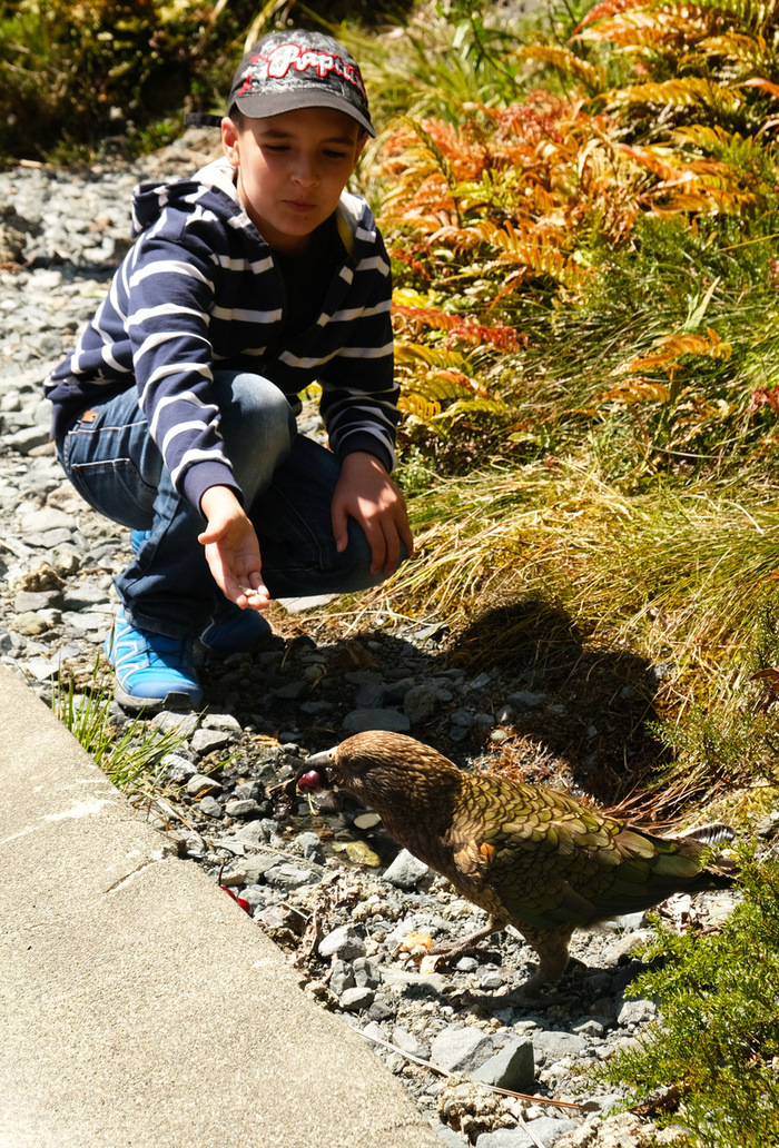 Зажегся зелёный, кеа быстро убрался в кусты. Хитрая птица, видимо, приватизировала тоннель и берет с людей плату, как Остап Бендер за посещение Провала. Взамен позволяя с собой фотографироваться. Это высшая ступень эволюции платных фотографов: не мужик с обезьянкой или птицей, а сама обезьянка или птица.