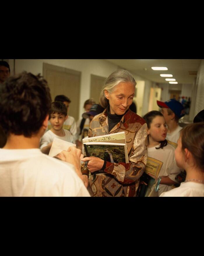 Рассказ о Джейн Гудолл, пожалуй, стоит начать издалека. Несколько лет назад она была в гостях у нью-йоркской художницы Эми Морган, у которой живет уникальный попугай жако по имени Нкизи. Словарь Нкизи составляет около тысячи слов, к тому же он осмысленно строит предложения. Увидев Джейн, он якобы произнес: “Это Джейн, у тебя есть шимпанзе”. Он никогда не видел Джейн, только в кино или на фото, и никогда до этого не говорил “шимпанзе”!