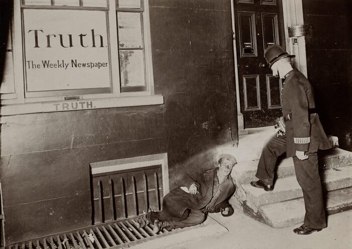Полицейский светит фонариком на мужчину, спящего на тротуаре. Надпись на окне "Истина. Еженедельная газета":