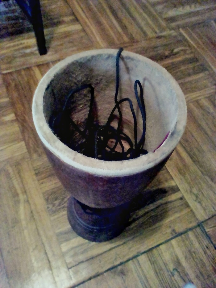 Вот уже пару лет моей большой страстью является игра на джембе. Это поразительный инструмент, процесс игры на котором вводит в настоящий транс. Но так уж вышло, позволить купить себе хороший джембе я не могу. Ценники даже на б/у инструменты начинаются примерно от 5-6 тысяч и уходят за горизонт. Для меня это достаточно серьёзная сумма. Но год назад, ползая по развалам одного известного сервиса объявлений, я наткнулся на деку небольшого барабанчика 8 дюймов в диаметре всего за 500 рублей, родная мембрана была порвана. Тут же связавшись с продавцом, я быстренько забрал её себе, причём, женщина, продавшая мне данный корпус, скинула ещё 200 рублей за то, что на барабане не было не только мембраны, но и кольца, которое эту мембрану удерживает. Вот так выглядел "скелет" инструмента сразу после покупки (прошу прощения за качество фото, нормальной камеры на тот момент у меня тоже не было, а снимать процесс ремонта я начал не сразу, не было мысли делать этот пост):