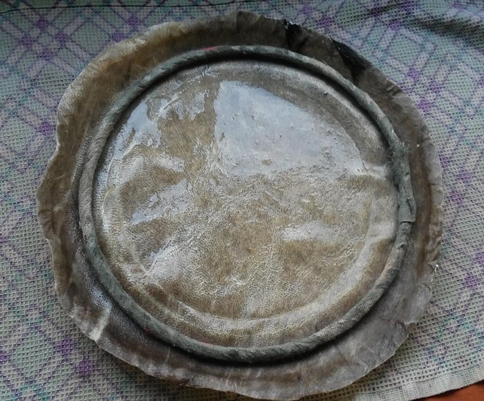 В качестве мембраны я использую кусок шкуры козы, да простят меня все веганы, зоозащитники и прочие жалельщики животных. Мне и звук, и тактильные ощущения при игре на коже нравятся куда больше, чем на пластиковых или ещё каких искусственных мембранах.