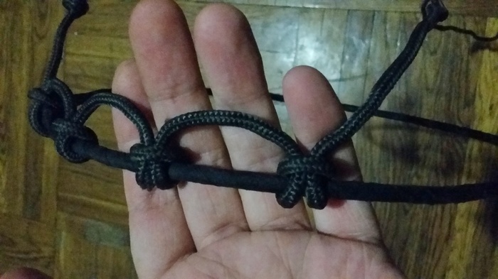 Затем верёвка продевается через петли на ободах, соединяя оба кольца, пока что без натяжения. Как видно на фото, конец веревки продевается в одну петлю, а затем в другую так, чтоб она огибала узел между петлями.