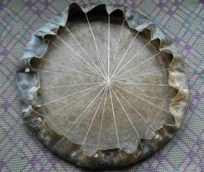 Вымоченную кожу расправляем на столе "лицом" вверх, сверху располагаем обод без верёвки. Аккуратно загибаем края кожи, фиксируя при помощи иголки с ниткой. Стараемся мягко расправить образующиеся в процессе складки. Не нужно пытаться с силой натягивать кожу на данном этапе, но и допускать сильного провисания мембраны не стоит. В итоге получаем конструкцию, слегка напоминающую бубен.