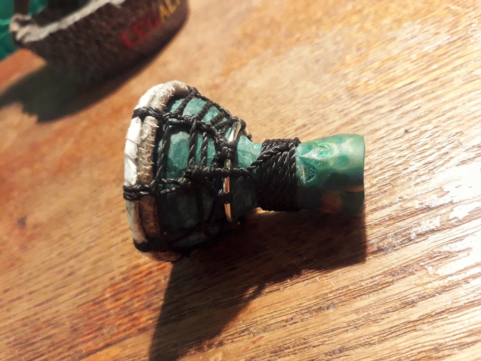 Кусок подходящей кожи у меня остался с ремонта другого джембе, недостающее кольцо сделал из куска толстой жёсткой проволоки. Уже вполне можно было играть, что я и делал некоторое время, собрав барабан воедино, но внешний вид инструмента не давал мне покоя, поэтому решено было несколько облагородить экстерьер.
