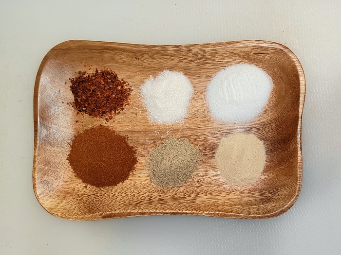 За это время подготовим маринад. В глубокой миске смешиваем 2 ч.л. копченой паприки, 3 ч.л гранулированного чеснока, 1ч.л молотого чили перца, 1 ч.л. сахара, 10 гр. нитритной соли и 1 ч.л обычной соли. Для получения приятных цитрусовых ноток раскатываем лимон по рабочей поверхности, чтобы он лучше отдавал сок, разрезаем его пополам и выдавливаем его сок в миску к приправам. Добавляем в маринад 100 мл. соевого соуса. Затем перемешиваем всё вместе до полного растворения соли и сахара.