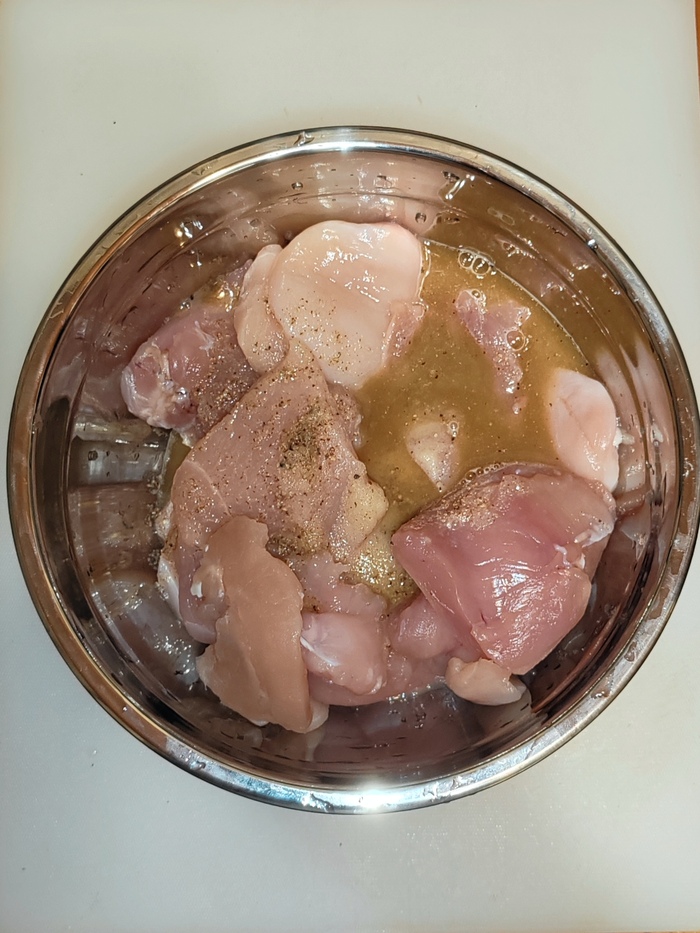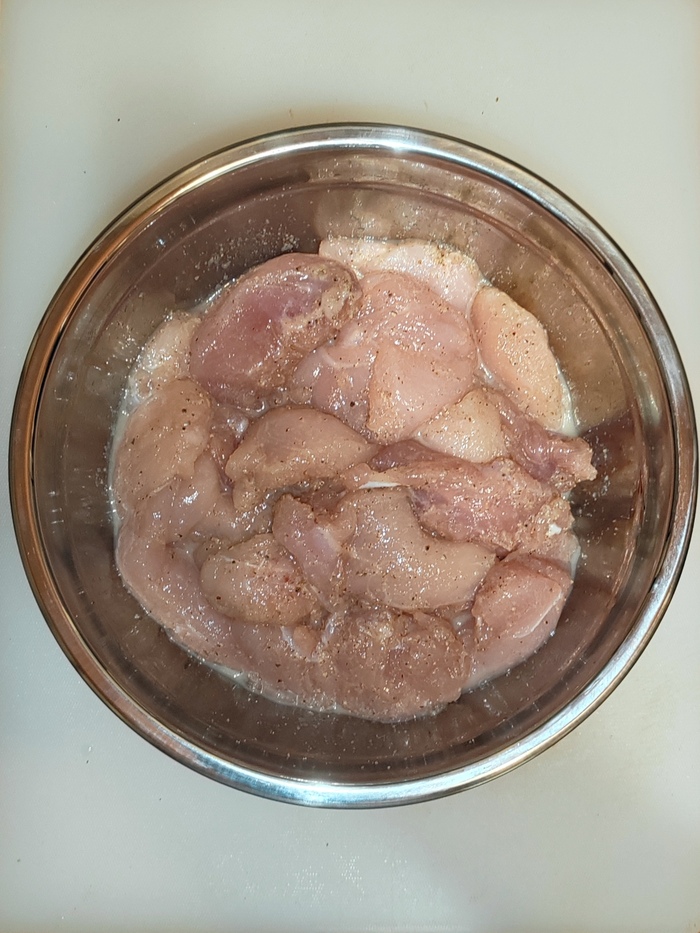 Перекладываем нарезанную курицу в глубокую миску, в которой она будет мариноваться. Заливаем содержимое миски подготовленным маринадом. Перемешиваем всё вместе, чтобы каждый кусочек курицы был покрыт маринадом со всех сторон и убираем на ночь в холодильник.
