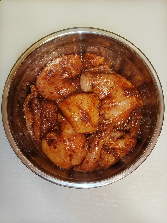 3. Смешиваем все сухие (кроме кунжута!) и жидкие ингредиенты. Смешиваем с растворившимся сорбатом калия. Выливаем получившуюся жижу к кускам куры.