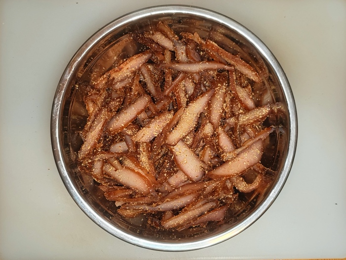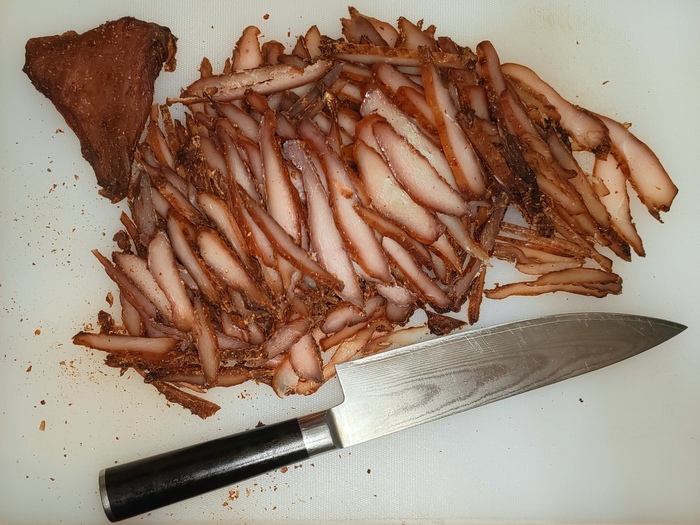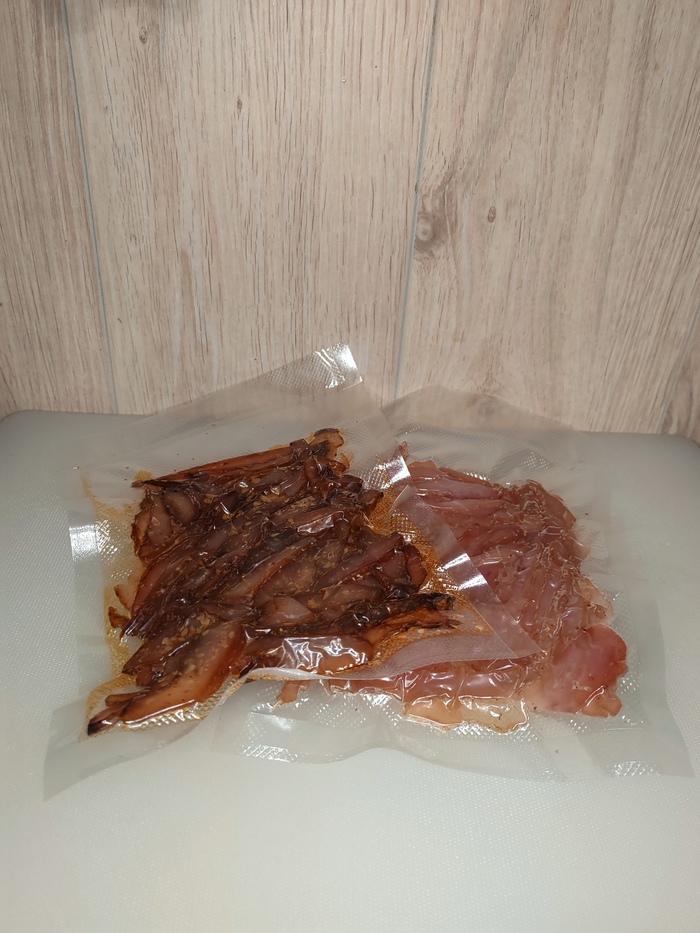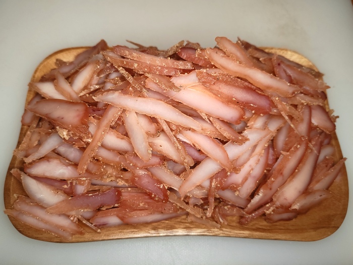 Кто-то начнёт говорить, что нитритная соль и сорбат калия нафиг не нужны, и я с такими людьми, в принципе, соглашусь. Однако наличие этих ингредиентов позволяет сделать этот снек достаточно долгоиграющим. Ну или, как минимум, убедить себя в этом.