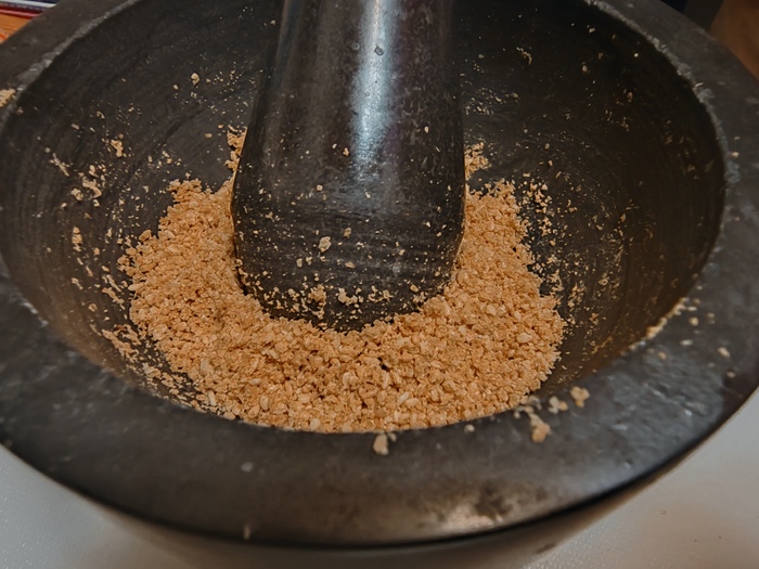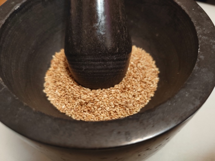 9. В одном из рецептов фигурирует соевый соус, так что, какие-то азиатские вайбы уже наличествуют. Надо бы их маленько прокачать. Берем кунжут и обжариваем его на сухой сковороде до золотистого цвета. Ссыпаем его в ступку и растираем. Не превращаем его в тхину, а просто давим, чтобы масло уже начало чувствоваться и пахнуть, но структура кунжута ещё прослеживалась.