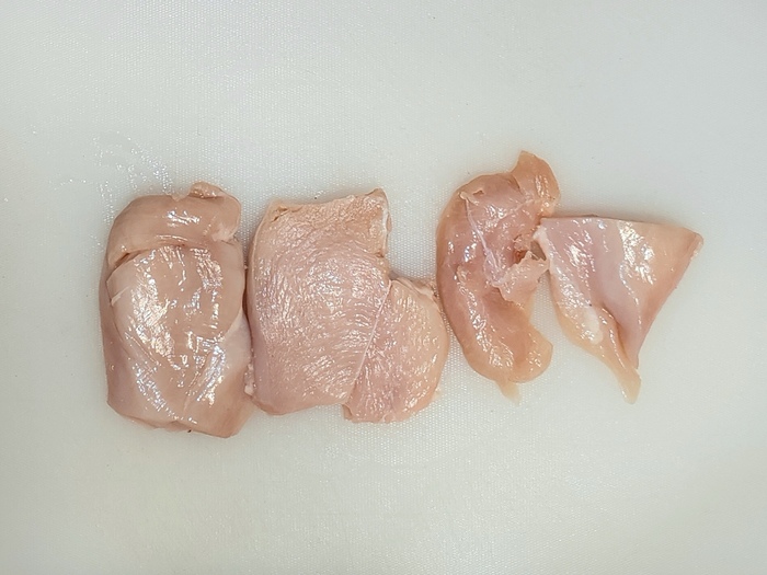 Курогруди очищаем от всего, что не нравится (кости, плёнки, жилы, etc...), и нарезаем на три-четыре части: отделяем малое филе, отрезаем нижнюю (самую тонкую) часть и, при необходимости разделяем мясистую часть на два куска. Как вариант, толстую курву можно просто качественно отшлёпать ножом и она постройнеет.