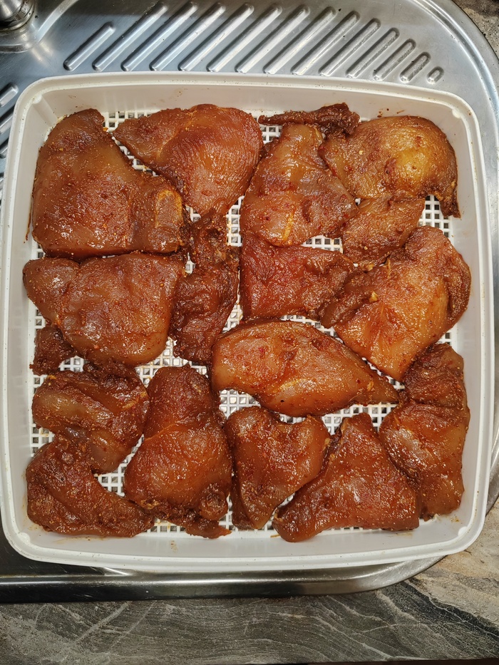 5. Внезапно вспоминаем о том, что вообще-то у нас тут мясо на засолке и нужно продолжать. Достаём всё это безобразие из холодильника и раскладываем на решётки дегидратора. Можно укладывать достаточно плотно - всё равно, оно скукожится со временем.