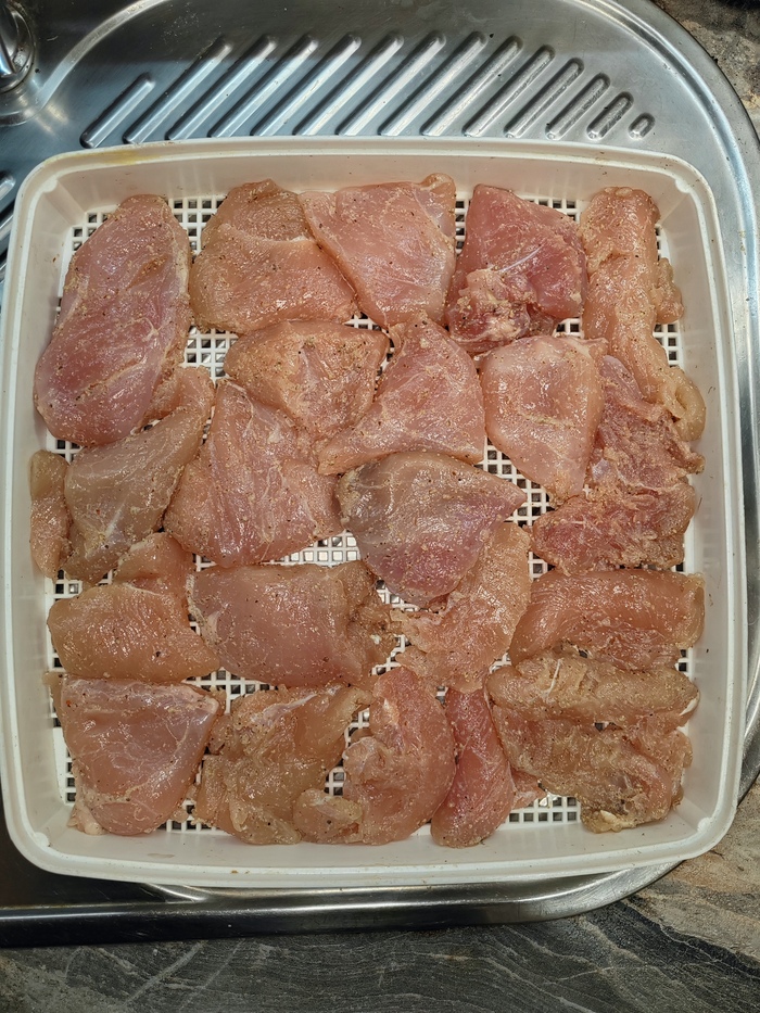 На следующее утро выкладываем замаринованную курицу на противни дегидратора. Старайтесь, чтобы кусочки курицы как можно плотнее находились друг к другу, при этом они не должны соприкасаться. При таком размещении курицы на противнях дегидратора она отлично просушится со всех сторон, кусочки курицы не будут слипаться между собой и не останется не просушенных, либо плохо просушенных участков. По моему мнению, лучше вялить джерки в несколько заходов разложив их правильно, чем все в один заход испортив при этом итоговый результат. Помещаем противни с курицей в дегидратор.