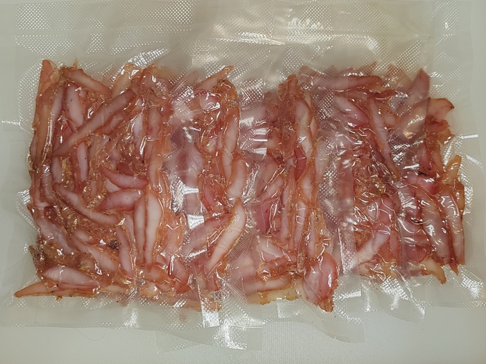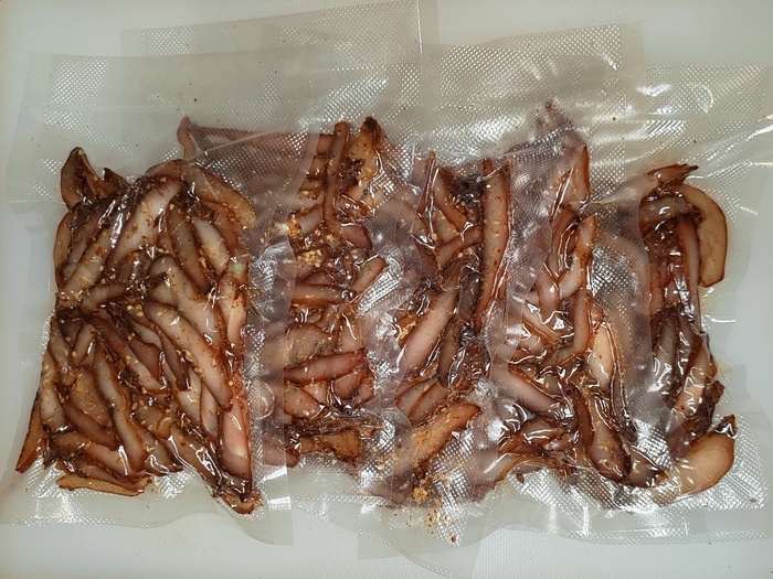 11. Расчехляем пакеты для вакууматора и фасуем мясо в них (напоминаю про стремящийся осыпаться кунжут). У меня в каждом пакете где-то 110-130 граммов. После чего закатываем всё в вакуум и кидаем в холодильник дня, хотя бы, на три. Этот этап необходим для нормального выравнивания влажности и солёности в продукте, так-то на него можно благополучно забить, но..