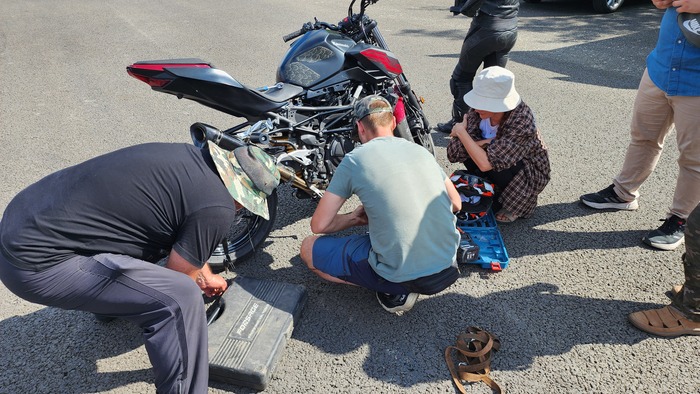 А ещё - это постоянные тренировки, падения в попытках нащупать грань возможного, экипировка как расходник или вот такие поломки на пустом месте. Потому что эффективный на джимхане мотоцикл уже не поедет на дороги.