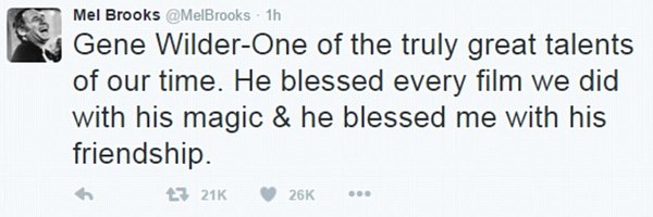 "Один из крупнейших талантов нашего времени. Он благословил каждый фильм, который мы делали вместе, своей магией, а меня своей дружбой", - написал в Twitter режиссер Мел Брукс.