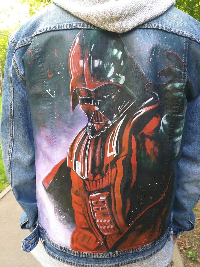 Джинсовая жилетка, краски на акриловой основе... Делал не я, жилетка была вероломно выкрадена и торжественно вручена через неделю) В живую очень интересно смотрится, рисунок из-за фона очень плотный, шершавый на ощупь.