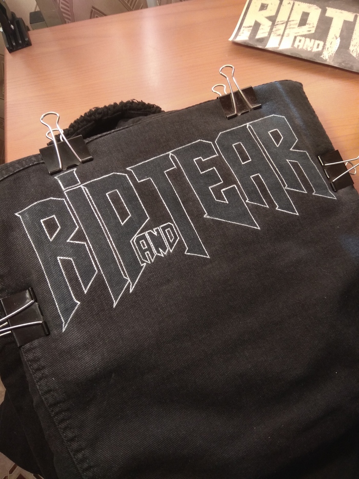 Далее начал "заливать" надпись краской, джинса темная,поэтому ее расход немного больше чем обычно. Кисти брал синтетические - они не "линяют" и неплохо отдают.