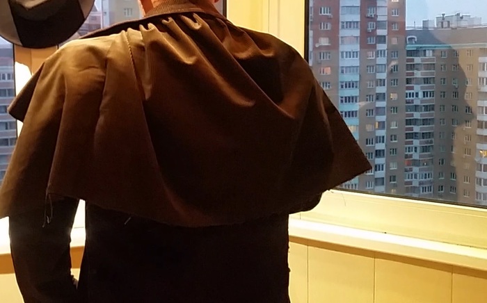 После того, как топор и футболка с ботинками были готовы, я зашел на сайт, посвященный кино-реквизита, на котором детально смог разглядеть плащ-пальто, в которое был одет Крипер. оказалось, что моё пальто недостаточно длинное, а моя накидка на плечах раза в 4 короче той, что была в фильме. После посещения магазина тканей я взял все, что было нужно и супруга помогла это дело пришить, а я состаривал бритвой, ножницами и гуталином)