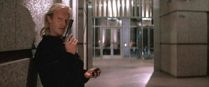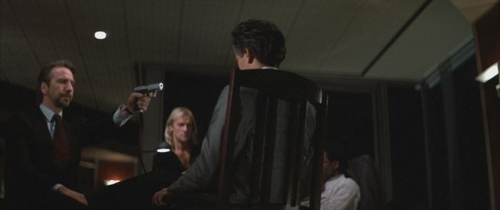 Ганс стреляет в голову Такаги. Когда происходит выстрел, кадр тут же меняется, потому что, согласно словам режиссера Джона Мактирнана, Алан Рикман инстинктивно вздрагивал при выстреле и актеру так и не удалось преодолеть испуг.