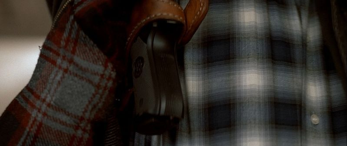 Так как Брюс Уиллис - левша, то и кобура у него под левую руку.