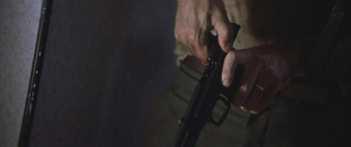 Чтобы проверить Ханса, Джон идет на хитрость. Он вставляет новый магазин в пистолет, отводит затвор назад, "досылая патрон" и удерживает пальцем рычаг затворной задержки. Затвор не остается в крайнем заднем положении, как это должно быть. Таким образом Джон заставляет Ханса поверить, что пистолет заряжен и готов к стрельбе, хотя это совсем не так.