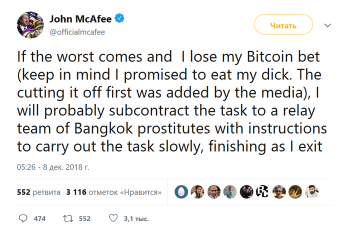 В 17 году создатель известного антивируса прославился своим твитом, что если биткойн за три года не дорастёт до 500 000 долларов за штуку, то он съест свой член.