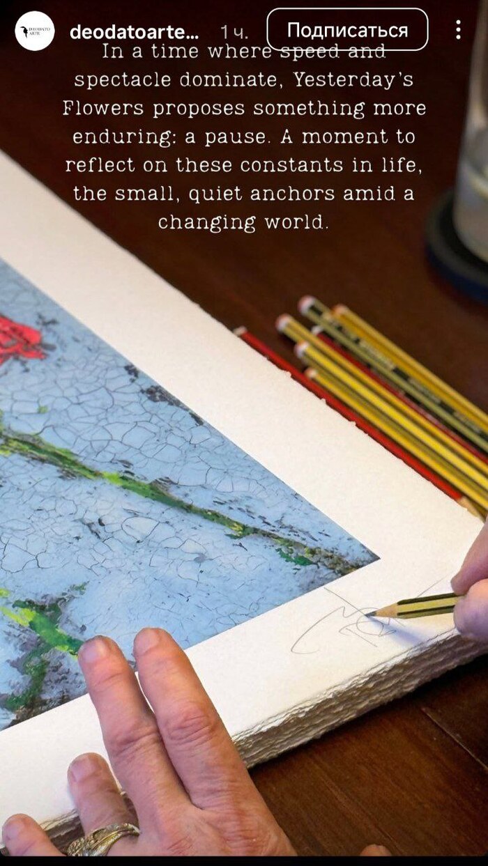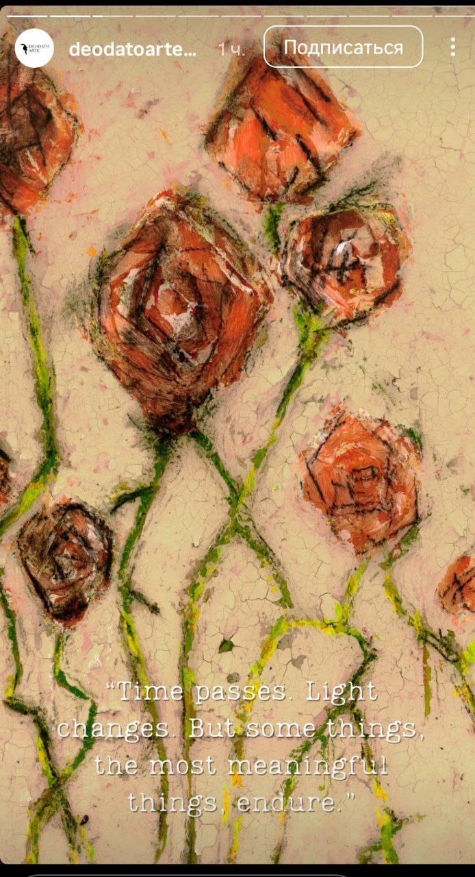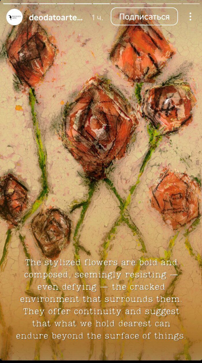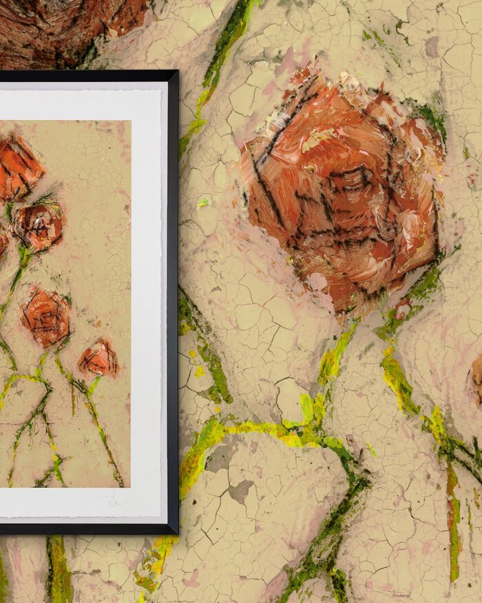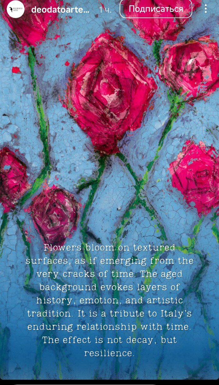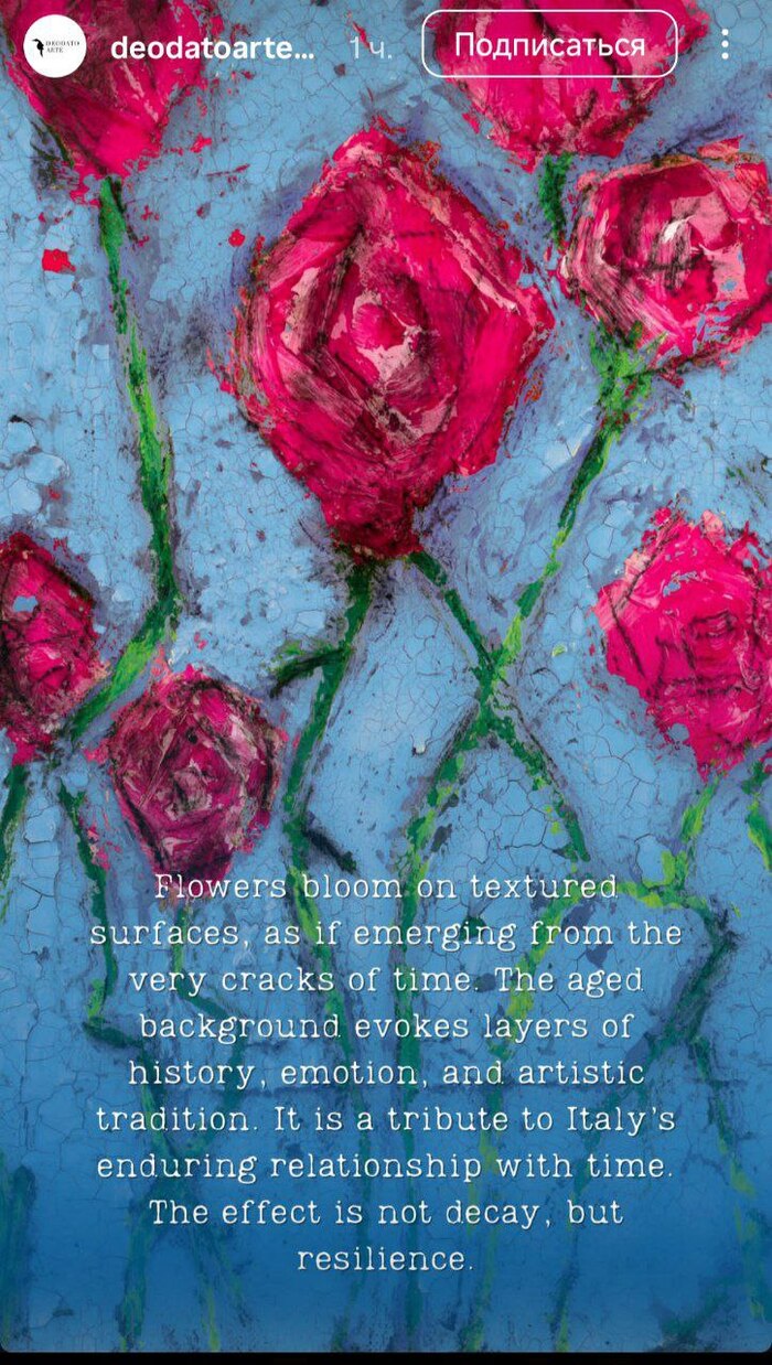 Цветы распускаются на текстурированных поверхностях, словно вырастая из трещин времени. Состаренный фон напоминает о слоях истории, эмоциях и художественных традициях. Это дань уважения прочным отношениям Италии и времени. Результатом является не упадок, а устойчивость.