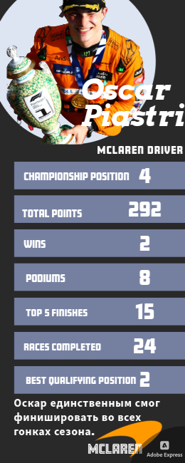 В McLaren на концовку сезона возвращаются равные возможности пилотов. Как только Пиастри решил помогать Норрису, поддержка перестала быть необходимостью. Всего один этап Оскару пришлось изображать источник бесплатных позиций для Ландо. Частично своими руками, частично с помощью судей британец отдал все то, что так тяжело досталось в спринте и квалификации. Наивно было ждать, что 16 позиций до Ферстаппена доживут до финиша гонки. Проигранный старт исключил возможность уехать вперед и не зависеть от тактики и решений стюардов.