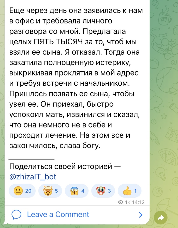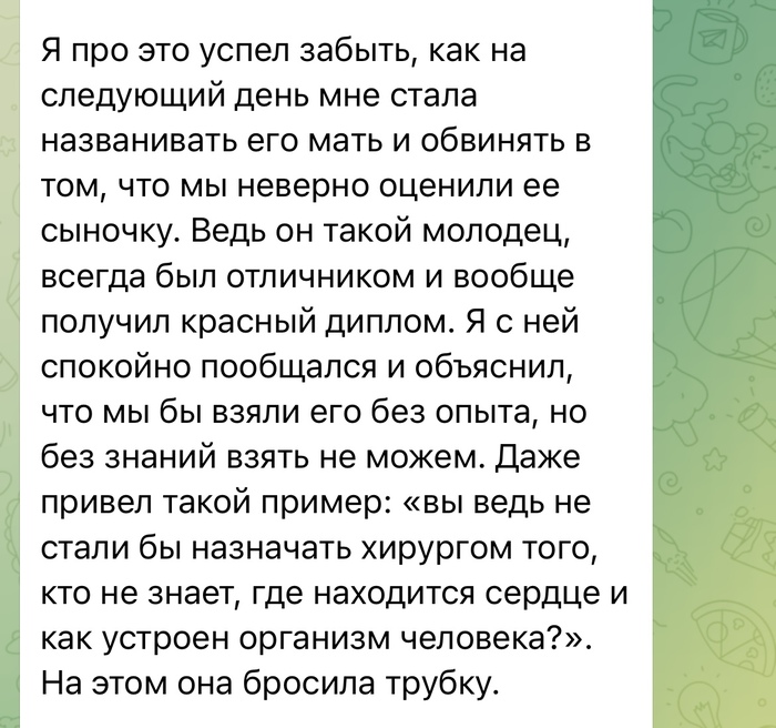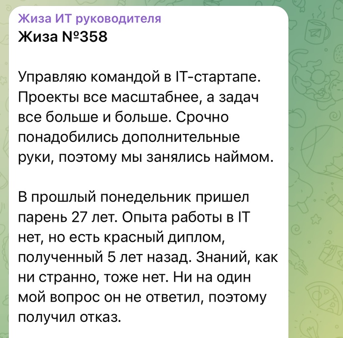 9 zhizait IT Тимлид против сумасшедшей матери соискателя 1 год назад Источник: «Жиза ИТ руководителя» Показать полностью 3 IT Работа Тимлид Стартап Собеседование Джун Истории из жизни Telegram (ссылка) Длиннопост Повтор Ещё 0