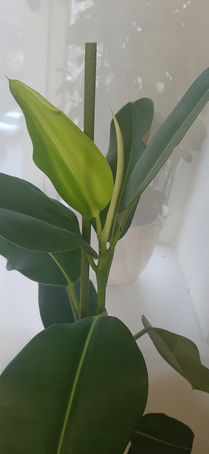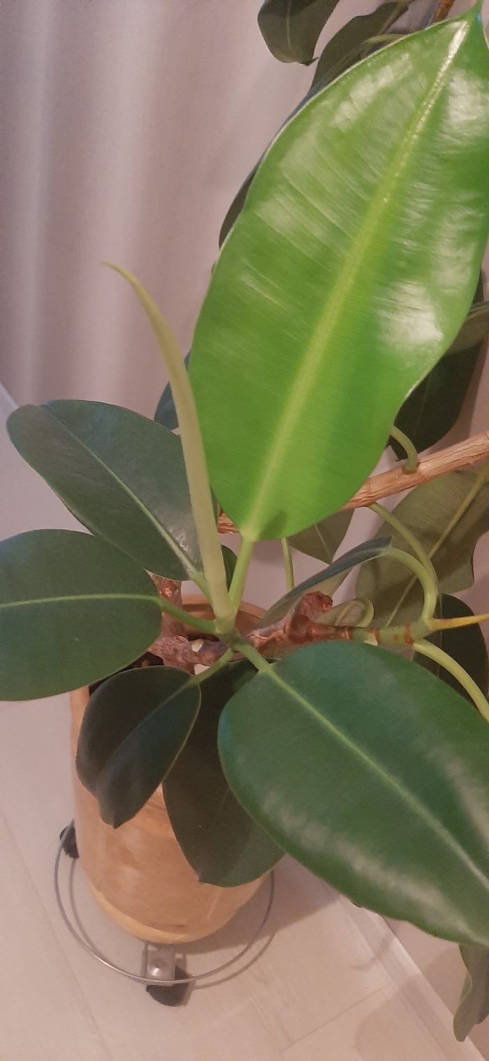 Оба фикуса эластика робуста продолжают давать листочки. Причём у старого фикуса проснулась давно спящая короткая веточка, о чем я уже и не надеялась.