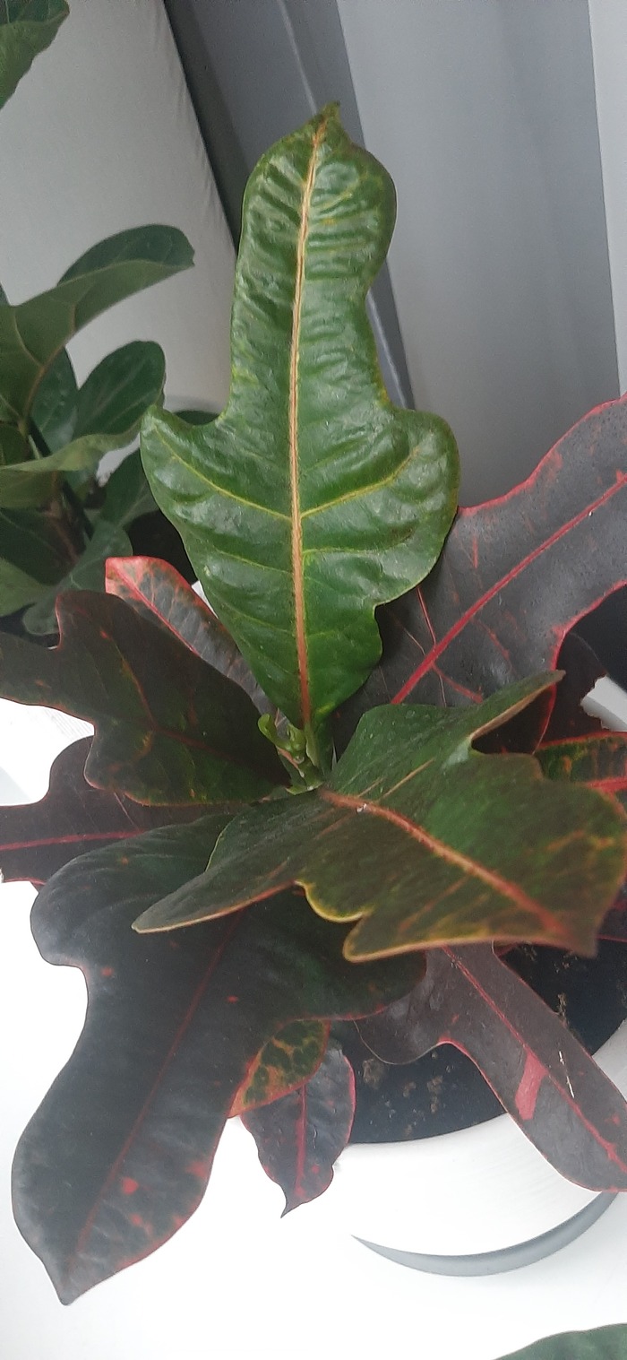 Кодеум, переставленный с подставки в гостинной на относительно солнечное окошко в спальне, выпустил маленькие рожки будущих листочков.