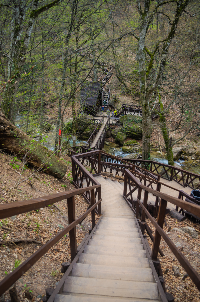 Самый высокий и самый известный. Водопад, к которому проще всего добраться. Можно даже маме с коляской или туристу 70+, ибо проложена асфальтированная дорожка без ступенек. Полноводен, пока идёт таяние снегов на плато Ай-Петри. Это примерно со второй половины февраля до начала мая. Мало кто знает, что обладая небольшой ловкостью, можно пробраться по тропинке за вывеской «Учан-Су» на ту площадку, куда падает вода – к статуе орла и сфотографироваться без страшненькой трубы водозабора.
