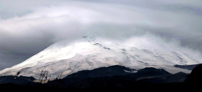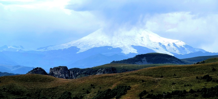 Эльбрус робко выглядывает между складками рельефа [https://www.google.com/maps?q=loc%3A43.4347954%2C42.5382843]