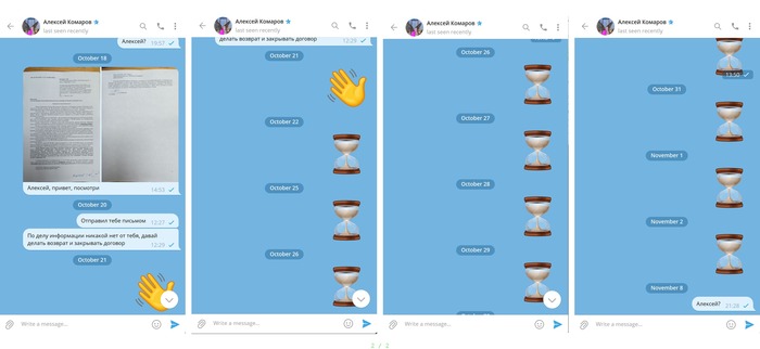 С октября он вообще перестал выходить на связь, трубки не берет, в мессенджерах не отвечает. Также заблокировал меня в группе в вк и удалил все комментарии с вопросами о том почему он меня игнорит везде.