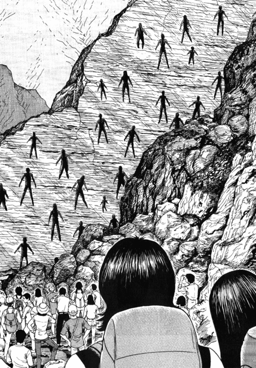 Короткая история "Загадка Амигарского ущелья" на английском языке опубликована на задней стороне второго тома его двухтомной серии "Гё" (еще одна замечательная манга, о рыбах с ногами! Они страшнее, чем кажутся, обещаю!). Книга даже не предупреждает о том, что там есть короткий рассказ, вы просто добираетесь до конца того, что читали, переворачиваете страницу с вопросом "Что это?" и невинно начинаете читать. История о землетрясении, которое открывает линию разлома в горе, обнажая кучу странных трещин в земле в форме людей. Звучит не особенно страшно, верно? Но никогда невозможно кратко описать, почему "Странная сказка" так пугает, особенно эта короткая история, и это в десять раз сложнее с такого рода мангой, где ответ на две третьих будет примерно таким: это жутко, потому что это выглядит так жутко! Жутко, потому что... потому что... в общем, видеть - значит верить.