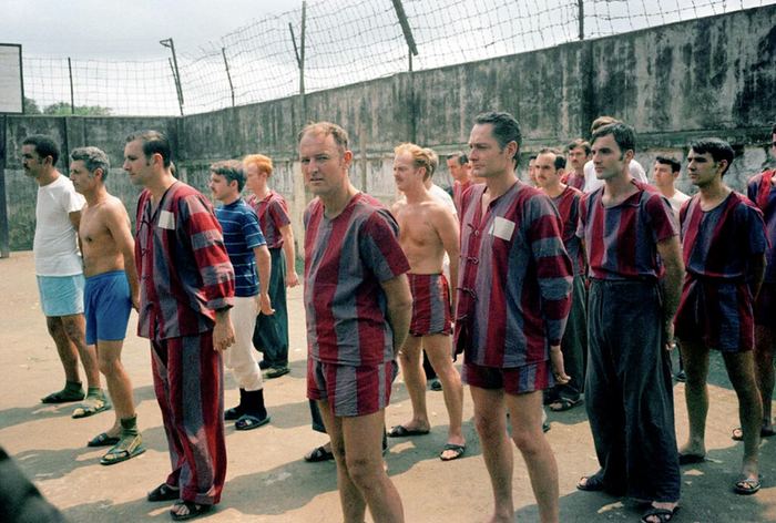 Американские военнопленные стоят на перекличке во дворе тюрьмы Нга Ту Со, Ханой, Северный Вьетнам, март 1973 года.