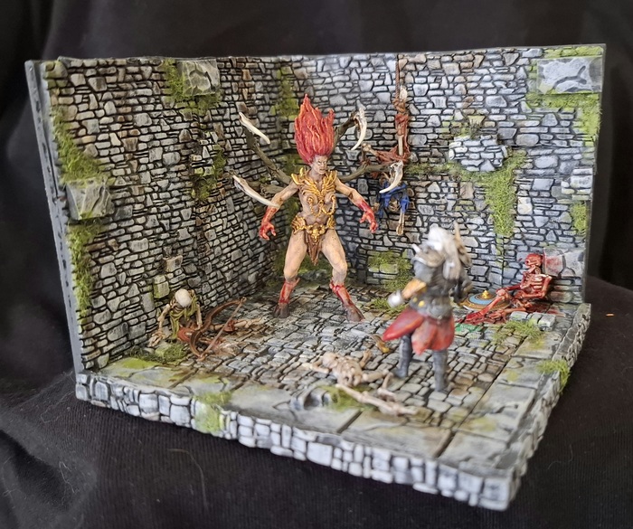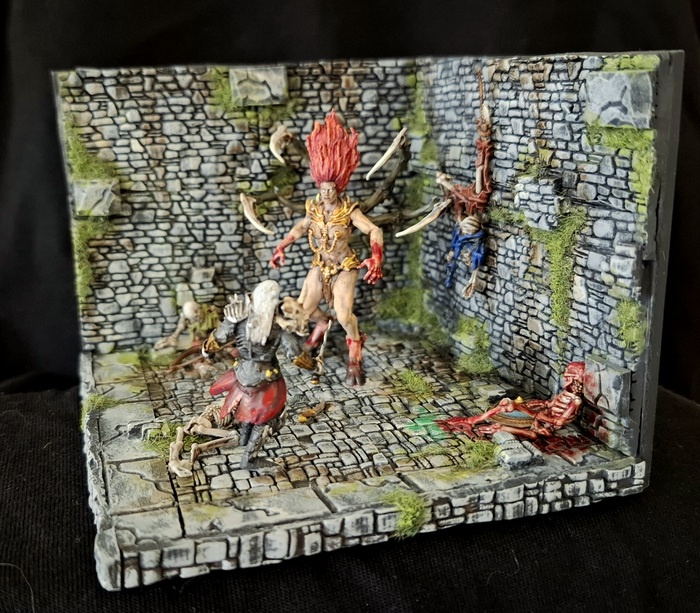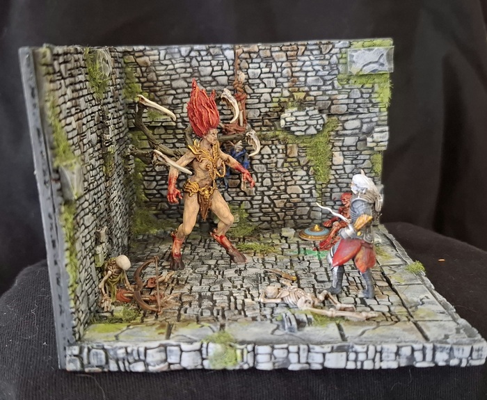 За пару вечеров, сваял диораму по культовой игре. Персонажи отпечатаны на 3D принтере, основа из вспененого пластика, текстура стен и пола из полимерной глины.