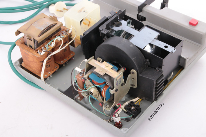 Вентилятор гонит воздух через конденсор, не допуская его перегрева - лампа 24В и 150Вт довольно горячая штучка.. Также привод задействован для смены слайдов. Корпус проектора - литой, металлический.