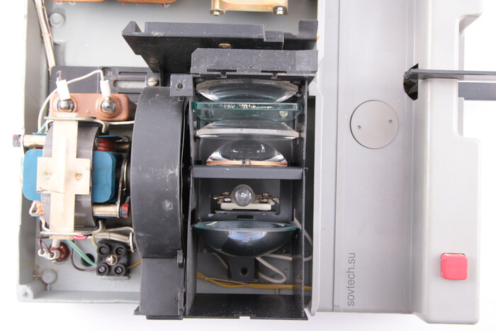 Из интересного - обычно диапроекторы содержали понижающий трансформатор, для питания проекционной лампы. Но у этого используется специально сделанная лампа, с питанием от 220В.