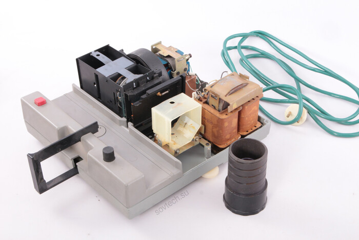 Внутри корпуса трансформатор для питания низковольтной галогеновой лампы, вентилятор охлаждения, одновременно служащий для привода механизма смены слайдов и блок конденсора.